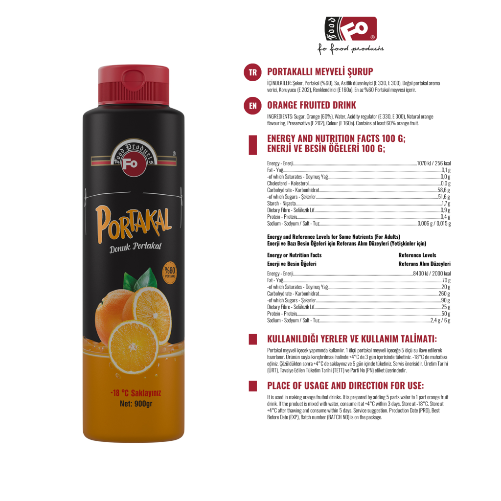 Usage: It is used in making orange fruit drink. It is prepared by adding 5 parts of water to 1 part of orange fruited drink. If the product is mixed with water, consume it within 3 days at (+ 4)˚C. Store at (-18)˚C. After dissolving, store at (+4)˚C. Contains at least 60% fruit.