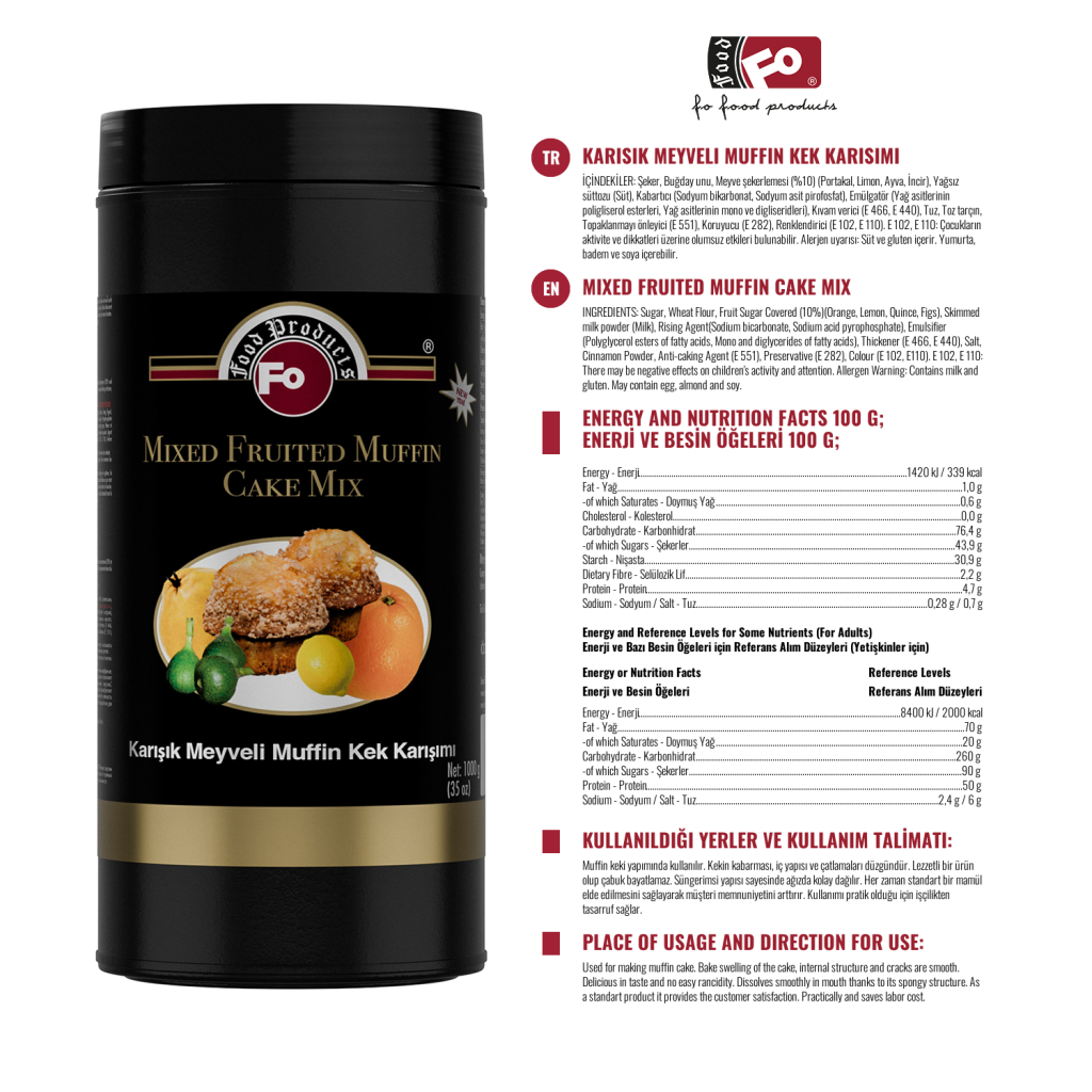 Usage: 1 kg Muffin Cake Mix; With the addition of 300 ml of oil, 250 ml of water and 250gr of eggs, it is whipped in the mixer for 6 minutes to form a dough. Then, the dough put into molds is baked in the oven heated to 160-180 °C for 20-25 minutes.