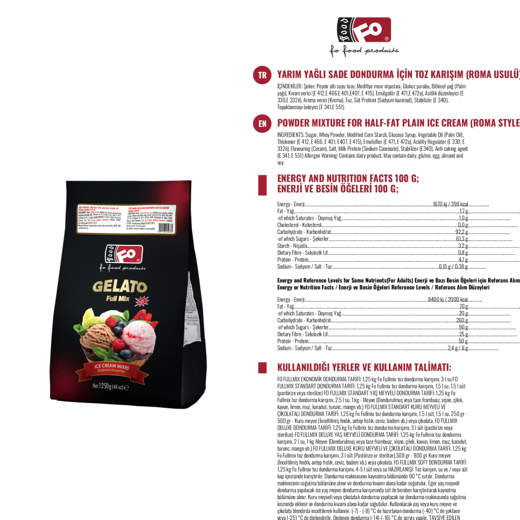 Usage: The powder mixture is mixed with water and/or milk in the container. If water or milk is used at 40-45°C, a more homogeneous mixture is obtained. It is taken to the cooling section of the ice cream machine and cooled until it has the consistency of ice cream. If fruit, dried fruit or chocolate ice cream is to be made, the fruit, dried fruit or chocolate to be used is thinned in a blender, added to the mixture and cooled in the ice cream machine. Ice cream prepared at (-7) - (-8)°C is either frozen at (-40)°C or rested at (-20)°C. Rested ice cream is served at (-14) - (-16) °C.