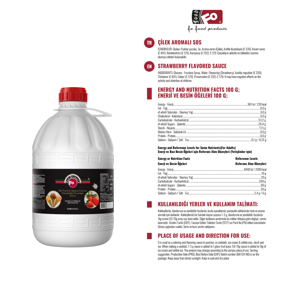 Product Features: Does not contain artificial sweetener. It is economical and practical as it is concentrated to be diluted at a ratio of 1 to 30. For cocktails, 1-3 dispensers (1-3 gr) are used; for other products, 50-70 gr of cocktail sauce per 1 kg of product is used. It is preferred in terms of aroma, color and density.
