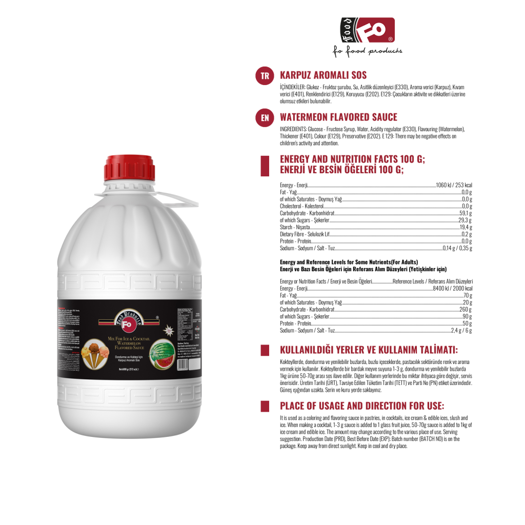Product Features: Does not contain artificial sweetener. It is economical and practical as it is concentrated to be diluted at a ratio of 1 to 30. For cocktails, 1-3 dispensers (1-3 gr) are used; for other products, 50-70 gr of cocktail sauce per 1 kg of product is used. It is preferred in terms of aroma, color and density.
