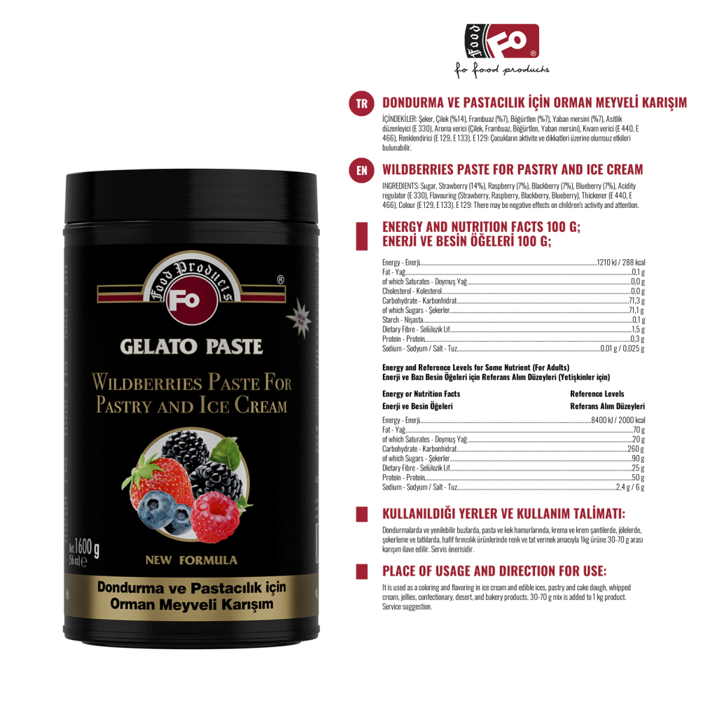 Product Features : Our fruit extract, which does not contain artificial sweetener and colorant, is ideal for obtaining different flavors in all seasons. To obtain the desired fruit flavor, it is sufficient to use 40-70 g per 1 kg of product. It has the unique taste, smell and color of real blackberry. It is a completely natural and concentrated product. It is practical and economical with its concentrated feature. It is a life buoy in the pastry industry when seasonal fruits are not available.