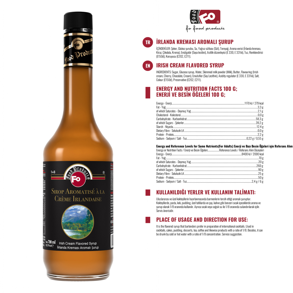 Lugar de uso: Se utiliza prácticamente en cócteles alcohólicos y no alcohólicos, cremas, nata montada, tortas, bizcochos, hielo comestible y granizados. Se usa prácticamente en cócteles alcohólicos y no alcohólicos, cremas, cremas, sitios de construcción, pasteles, pasteles, helados comestibles, granizados de hielo en la medida deseada. Se utiliza como 1,5-2 cl en bebidas frías y calientes como café con leche, capuchino, café de filtro, café con leche helado, frappe, batido, batido, congelado, cócteles, tés fríos y calientes. También se puede beber con agua / leche fría o caliente, preparada en una proporción de 1+8. Se agrega a todo tipo de postres en la medida deseada con el fin de dar sabor a productos de repostería como tartas, galletas, pasteles.