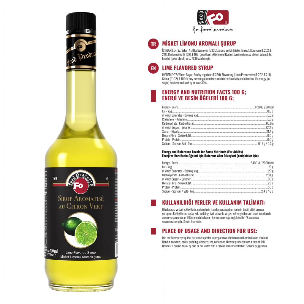 Especificación del Producto: No contiene edulcorante artificial. Da un aspecto estético a las vitrinas con su impactante y embalaje saludable. Se prefiere en términos de aroma, color y densidad. Aunque el grado Brix es un 10% superior al de otros jarabes de cóctel, es un 30% menos dulce. Incluso si se abre la tapa de la botella, el sabor, el color y la densidad no disminuyen hasta la fecha de caducidad después de cerrar la tapa de la botella.