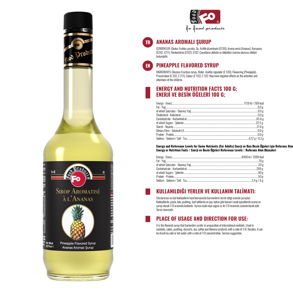 Especificación del Producto: No contiene edulcorante artificial. Da un aspecto estético a las vitrinas con su impactante y embalaje saludable. Se prefiere en términos de aroma, color y densidad. Aunque el grado Brix es un 10% superior al de otros jarabes de cóctel, es un 30% menos dulce. Incluso si se abre la tapa de la botella, el sabor, el color y la densidad no disminuyen hasta la fecha de caducidad después de cerrar la tapa de la botella.