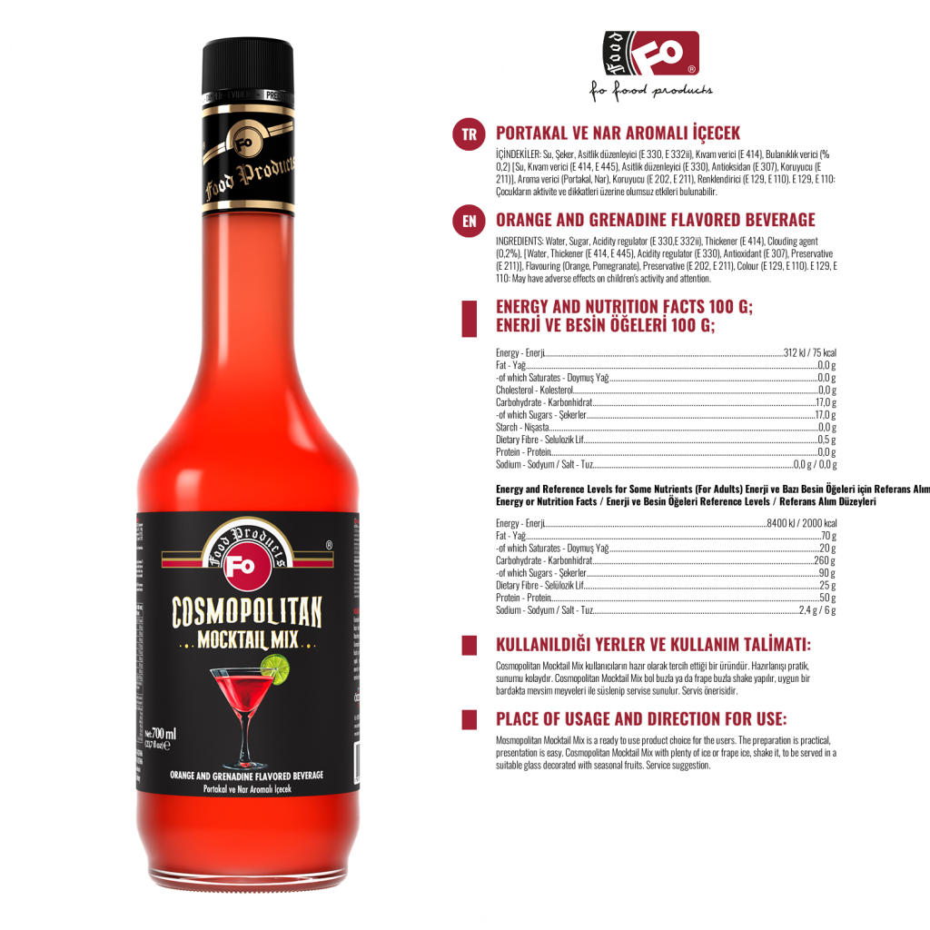 Tipo de Embalaje: 700 ml, Botella de Vidrio, Caja de 6 Unidades Vida Útil: 2 Años Campos de Uso: Es una mezcla preparada para cócteles que podemos utilizar en bares, cafeterías, restaurantes, hoteles, domicilios, con o sin alcohol. Uso: Se agita 7 cl de Cosmopolitan Mezcla Instantánea de Cóctel con 4 cl de ron o vodka y mucho hielo. Se sirve en copa de cóctel decorada con frutas de temporada. Si se prefiere sin alcohol, se prepara un batido Cosmopolitan Mezcla Instantánea de Cóctel de 7 cl con abundante hielo. Características del Producto: Es un producto preferido debido a su uso listo para usar. Es una mezcla donde puedes sentir los aromas de las frutas tropicales en tu paladar. Es práctico de preparar y fácil de presentar. Reduce los costes de preparación en un 40-50% gracias a su contenido. Ahorra tiempo y mano de obra en la elaboración de cócteles. Es un producto donde se pueden contagiar sabores reconocidos internacionalmente con su aroma y color en cada copa como estandarte. Proporciona trazabilidad del producto y control de inspección con su función independiente.