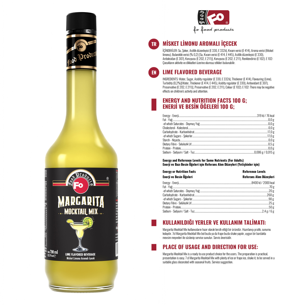 Tipo de Embalaje: 700 ml, Botella de Vidrio, Caja de 6 Unidades Vida Útil: 2 Años Campos de Uso: Es una mezcla preparada para cócteles que podemos utilizar en bares, cafeterías, restaurantes, hoteles, domicilios, con o sin alcohol. Uso: Se agita 7 cl de Margarita Mezcla de Cóctel con 4 cl de ron o vodka y mucho hielo. Se sirve en copa de cóctel decorada con frutas de temporada. Si se prefiere sin alcohol, se prepara un batido Margarita Mezcla de Cóctel de 7 cl con abundante hielo. Características del Producto: Es un producto preferido debido a su uso listo para usar. Es una mezcla donde puedes sentir los aromas de las frutas tropicales en tu paladar. Es práctico de preparar y fácil de presentar. Reduce los costes de preparación en un 40-50% gracias a su contenido. Ahorra tiempo y mano de obra en la elaboración de cócteles. Es un producto donde se pueden contagiar sabores reconocidos internacionalmente con su aroma y color en cada copa como estandarte. Proporciona trazabilidad del producto y control de inspección con su función independiente.