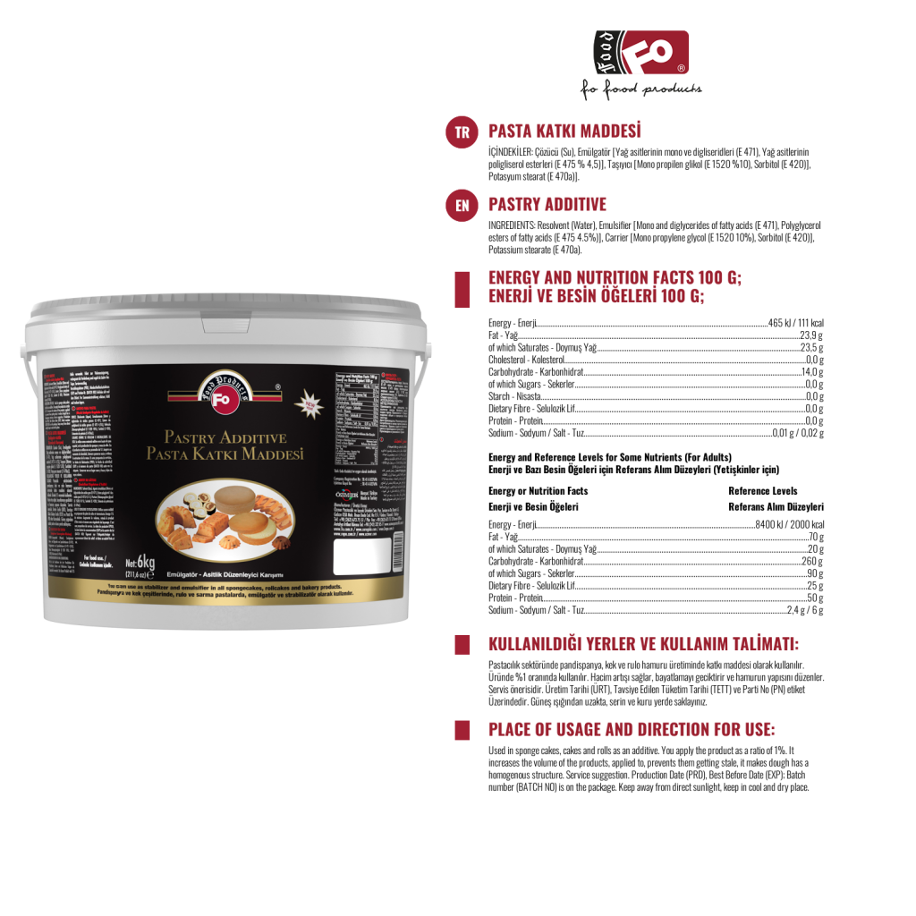 Emballage: 6 kg, saut en polypropylène, boite de 4 unités Durée de conservation: 2 ans Domaine d’utilisation: Utiliser pour la production de toutes les génoises, rouleaux, wraps et pâte à gâteau et pour ajouter du volume aux crèmes glacées. Mode d’usage: Mélanger directement en fonction du contenu du produit à réaliser et de la recette. Spécifications du produit: Ne contient pas de graisses animales ni d'additifs et est entièrement végétal. Augmente le volume de la pâte. Il régule la structure du produit final, retarde le rassissement et préserve sa saveur. Grâce à la structure spongieuse qu'il donne au produit, il empêche le produit de coller au palais. Fournit une structure homogène et empêche le glaçage des crèmes glacées. Corrige la consistance de la crème glacée, retarde sa fonte et préserve sa saveur. Produit standard et gain de temps. Il est recommandé d'utiliser de l'eau froide dans les endroits où l’additif de gâteau est utilisé afin de rendre la pâte plus dense.