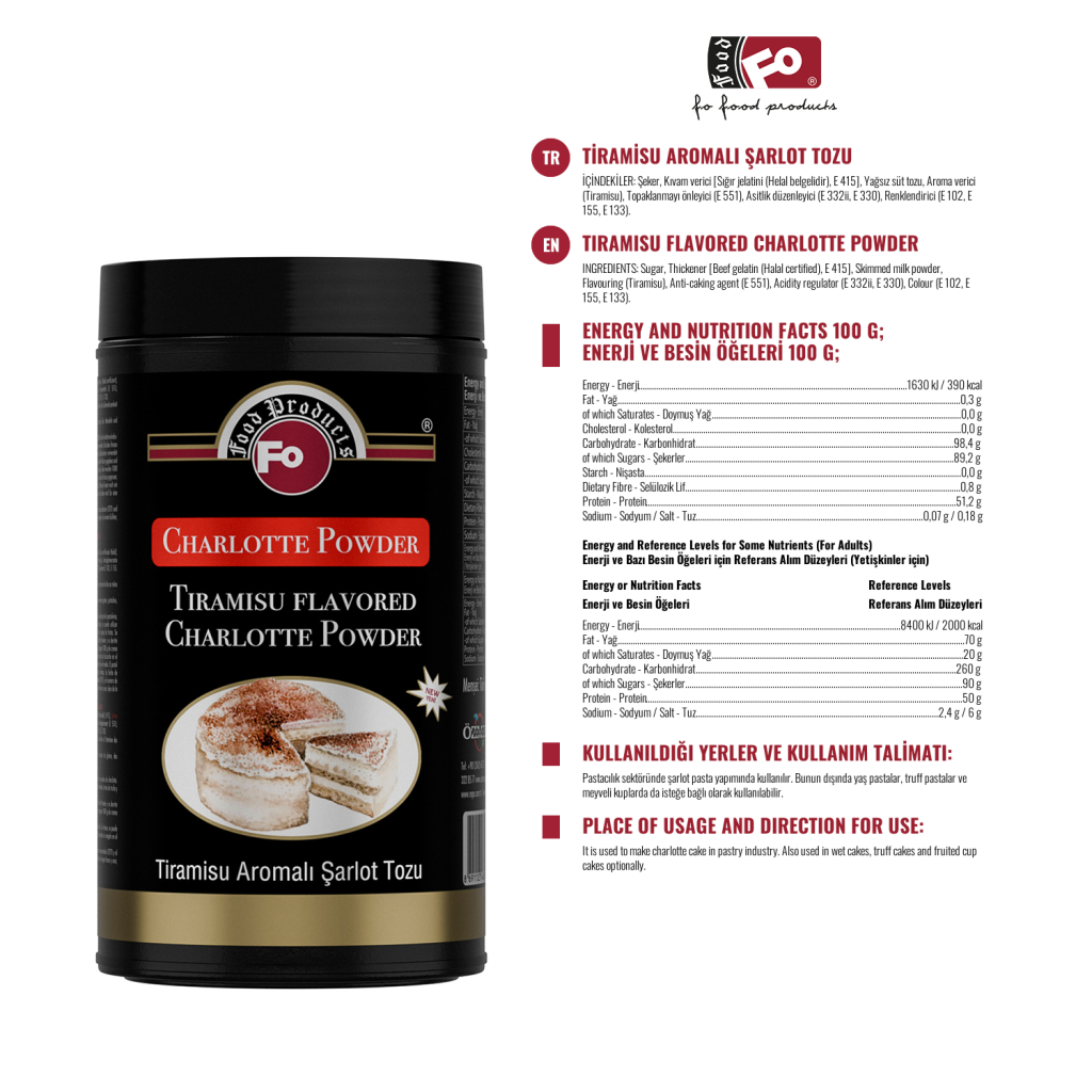 Emballage: 1 kg, sac en polyéthylène en aluminium pet, boite de 12 pcs Durée de conservation: 2 ans Domaine d’utilisation: Utiliser pour charlottes dans l'industrie de la pâtisserie. Peut également être utilisé en option dans des gâteaux humides, les gâteaux aux truffes et des coupes à fruits. Mode d’usage: Ajouter 250 g (25 °C) d'eau à 200 g de poudre de charlotte et mélanger et dissoudre à l'aide d'un fouet. Ajoutez ensuite 1 kg de chantilly et laissez bien mélanger. Verser sur la génoise. Vous pouvez ajouter une couche de génoise, si souhaité. Le gâteau préparé est congelé au réfrigérateur pendant un certain temps. Spécifications du produit: Mélange en poudre pour fabrication de glace. Il fournit une crème glacée facile à fondre, non cristalline et délicieuse. La crème glacée ne fond pas immédiatement à température ambiante. Produit pratique et économique. Ne s'agglutine pas lors de l'application.