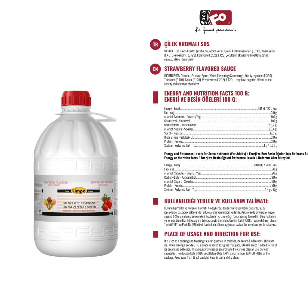 Особенности продукта: Не содержит искусственного подсластителя. Это экономично и практично, так как его можно концентрировать для разбавления в соотношении от 1 до 30. Для коктейлей используется 1-3 дозатора (1-3 гр); для других продуктов используется 50-70 г коктейльного соуса на 1 кг продукта. Он предпочтительнее с точки зрения аромата, цвета и плотности.