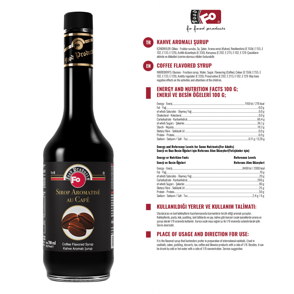 Ürün Özellikleri: Yapay tatlandırıcı içermez. Albenili ve sağlıklı ambalajı ile vitrinlerinize estetik bir görünüm kazandırır. Aroma, renk ve yoğunluk bakımından tercih nedenidir. Diğer şuruplara göre kuru madde oranı % 10 fazla olmasına rağmen, %30 daha az tatlıdır. Ağzı açıldıktan sonra kapak kapalı olarak muhafaza edilirse; son tüketim tarihine kadar aroma, renk ve yoğunluğunda herhangi bir azalma olmaz.