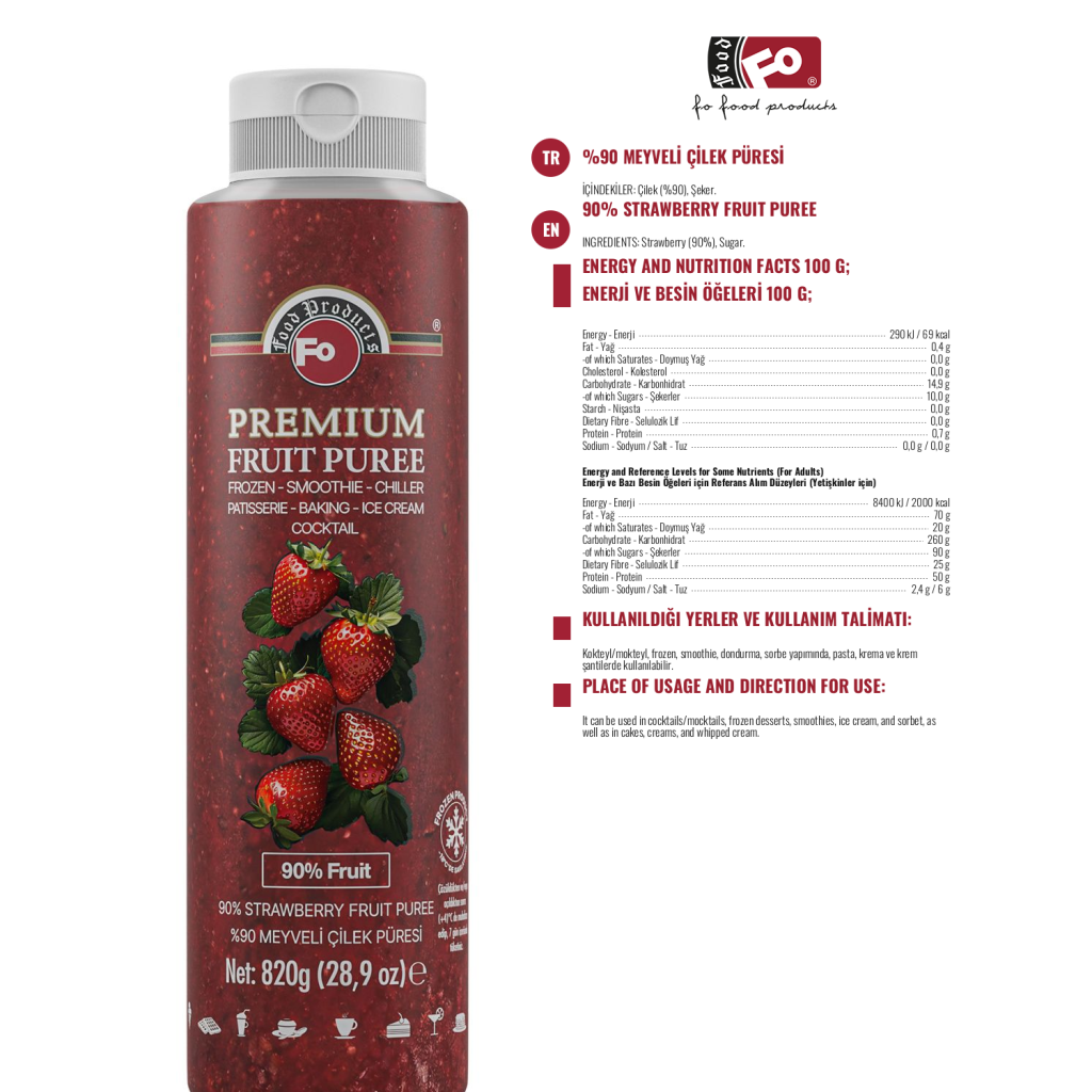 Çilek Meyveli Donuk Püre - Premium 820 g