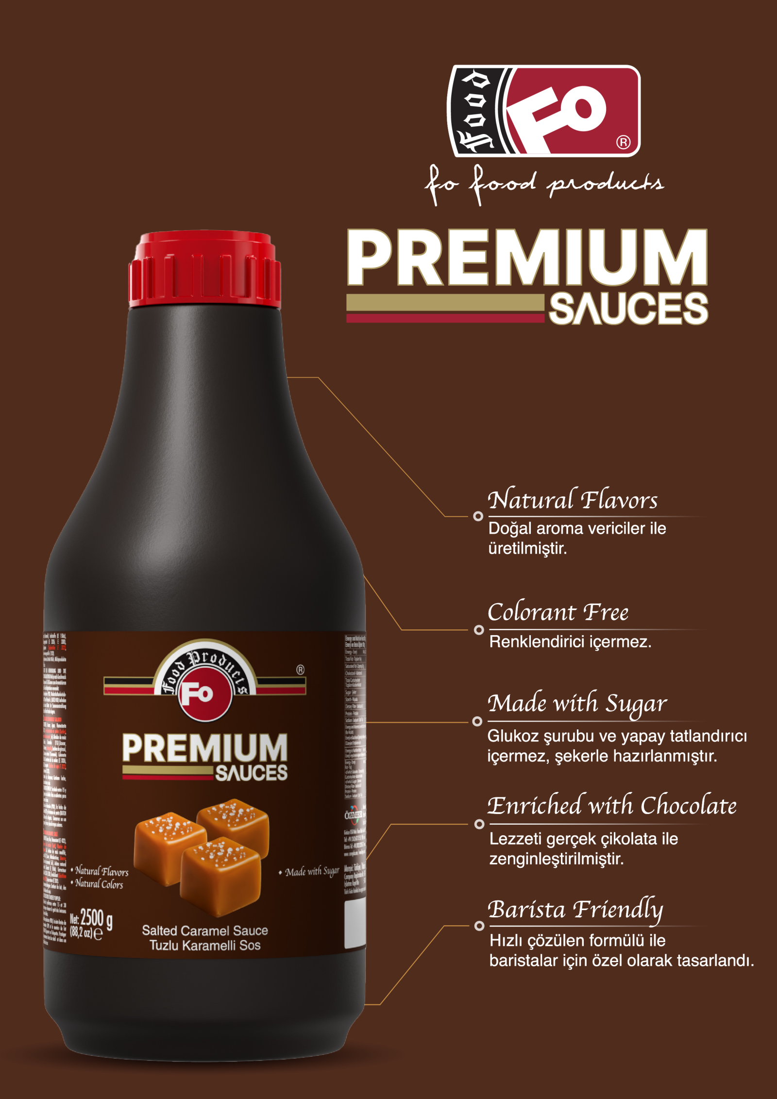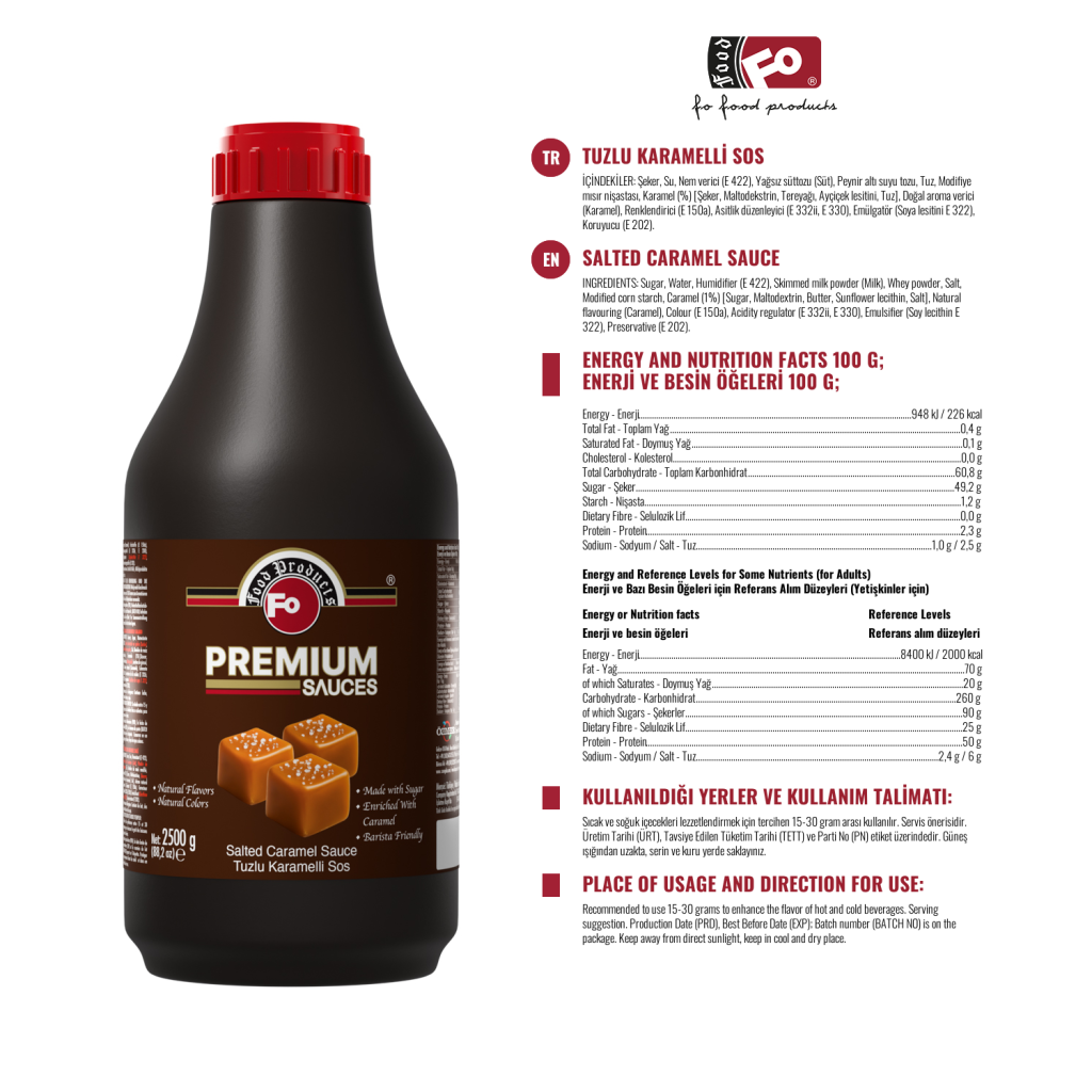 FO Tuzlu Karamelli Sos, tatlı karamel ve tuzun uyumlu birleşimiyle tatlılarınıza sofistike bir tat katar.