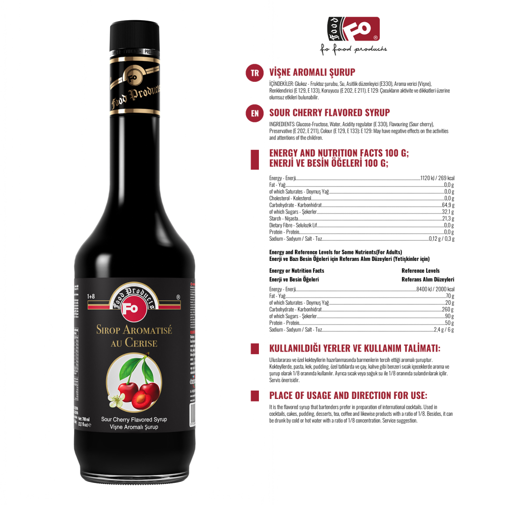 Ürün Özellikleri: Yapay tatlandırıcı içermez. Albenili ve sağlıklı ambalajı ile vitrinlerinize estetik bir görünüm kazandırır. Aroma, renk ve yoğunluk bakımından tercih nedenidir. Diğer şuruplara göre kuru madde oranı % 10 fazla olmasına rağmen, %30 daha az tatlıdır. Ağzı açıldıktan sonra kapak kapalı olarak muhafaza edilirse; son tüketim tarihine kadar aroma, renk ve yoğunluğunda herhangi bir azalma olmaz.