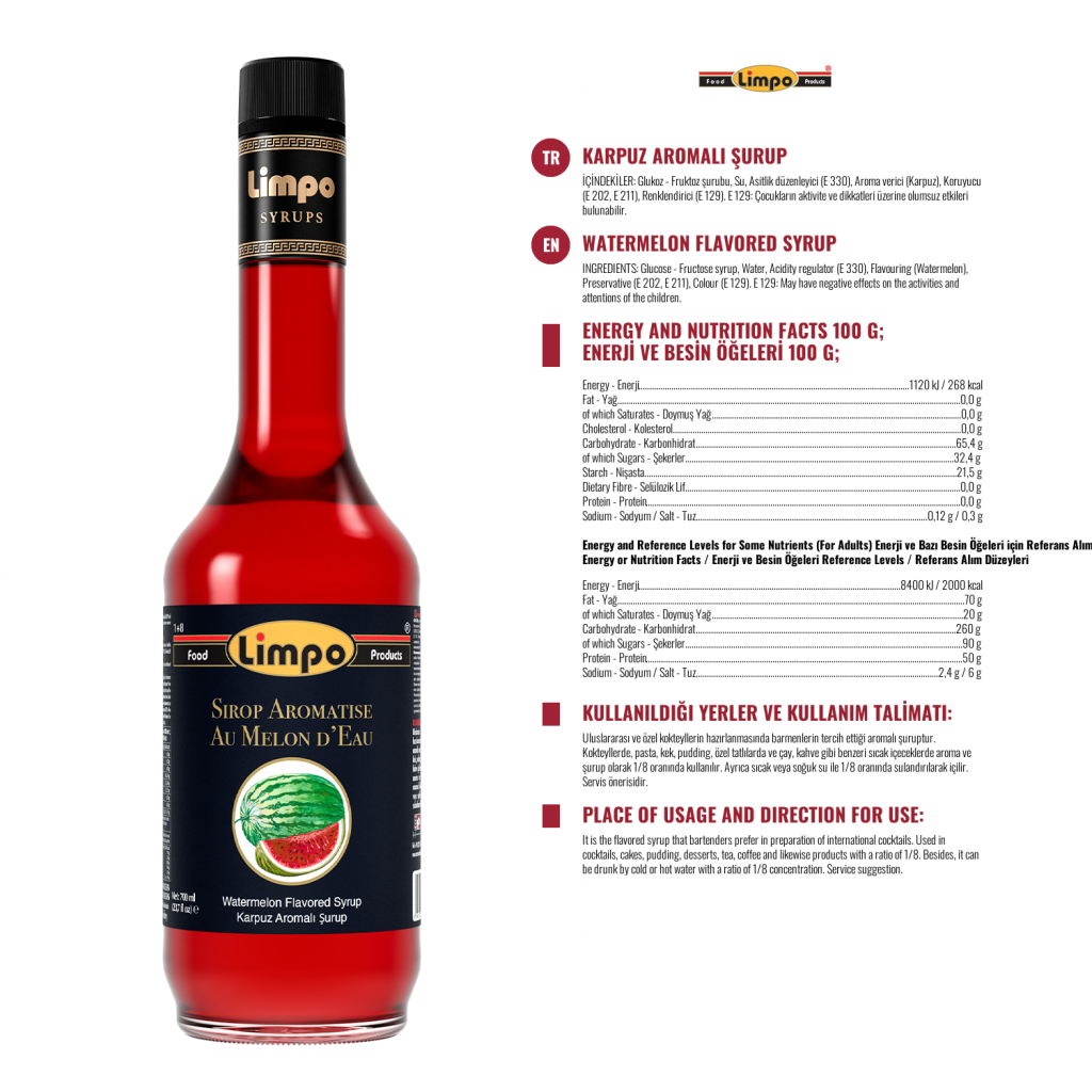 Ürün Özellikleri: Yapay tatlandırıcı içermez. Albenili ve sağlıklı ambalajı ile vitrinlerinize estetik bir görünüm kazandırır. Aroma, renk ve yoğunluk bakımından tercih nedenidir. Diğer şuruplara göre kuru madde oranı % 10 fazla olmasına rağmen, %30 daha az tatlıdır. Ağzı açıldıktan sonra kapak kapalı olarak muhafaza edilirse; son tüketim tarihine kadar aroma, renk ve yoğunluğunda herhangi bir azalma olmaz.