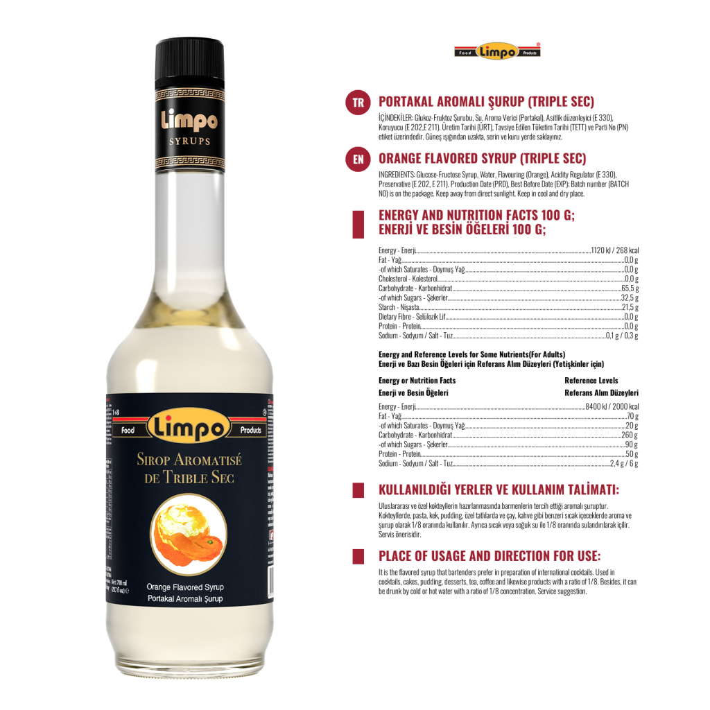 Kullanım Alanları: Alkollü ve alkolsüz kokteyllerde, kremalarda, krem şantilerde, keklerde, pastalarda, yenilebilir buzlarda, ice-slush’larda istenilen ölçüde pratik olarak kullanılır.