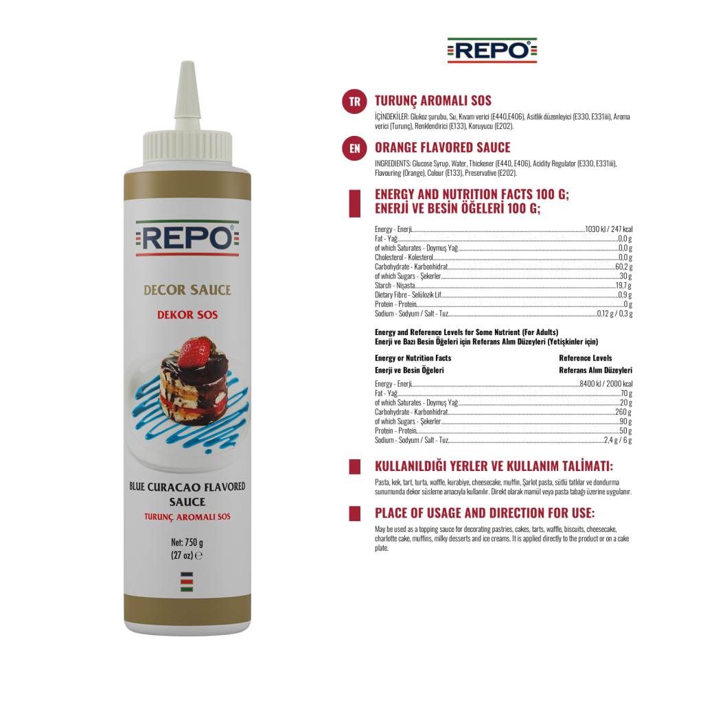 Kullanım Alanları : Dondurmalarda, kuplarda, pastalarda, meyveli yoğurtlarda, kahvaltı gevreklerinde, jölelerde, keklerde ve banket süslemelerde arzu edilen her yerde sos olarak istenilen miktarda kullanılır.