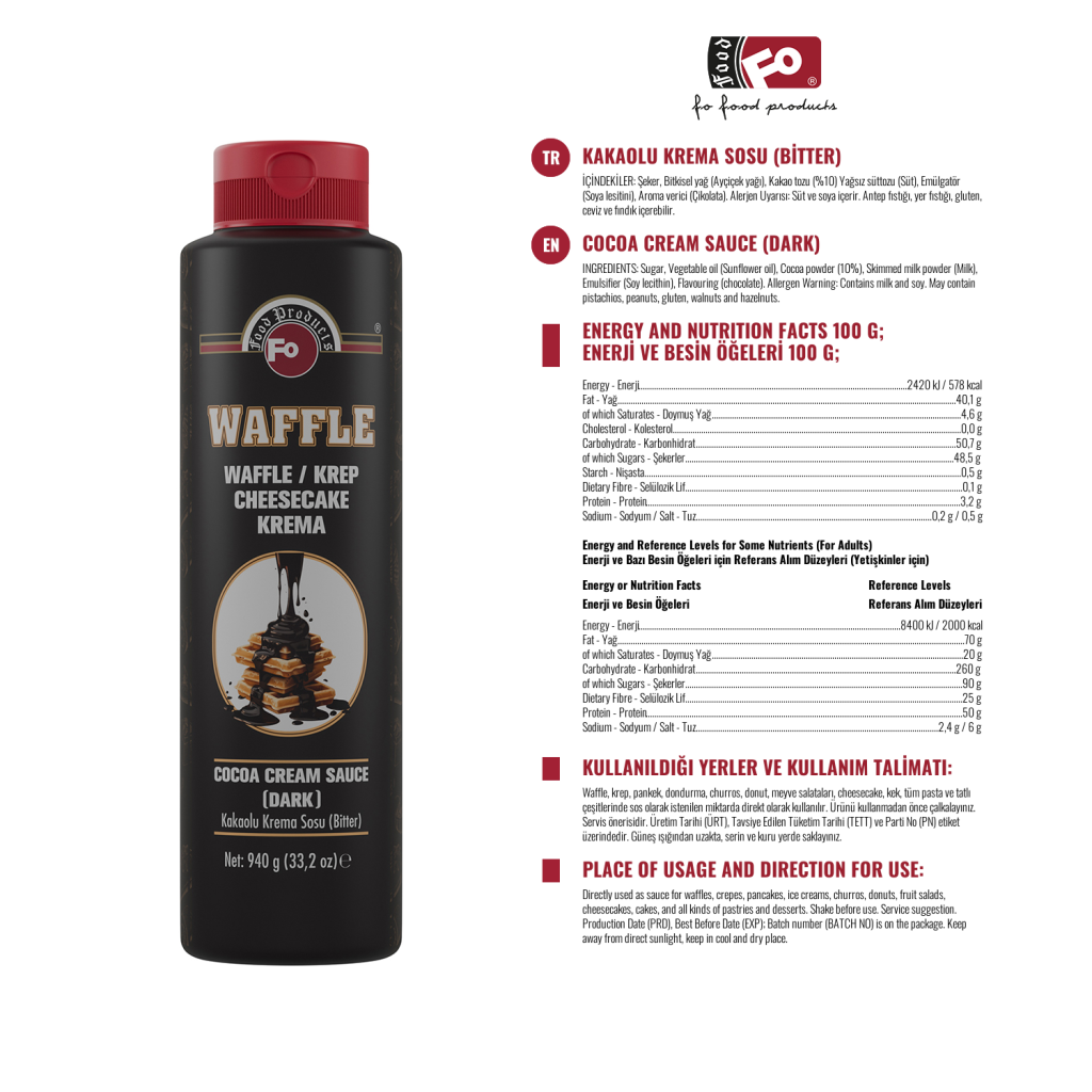 Kullanım Alanları: Waffle, krep, gözleme, dondurma, churros, çörek, meyve salatası, cheesecake, kek, her türlü kek ve tatlı sos olarak doğrudan istenilen miktarda kullanılır. Kullanmadan önce ürünü çalkalayın.