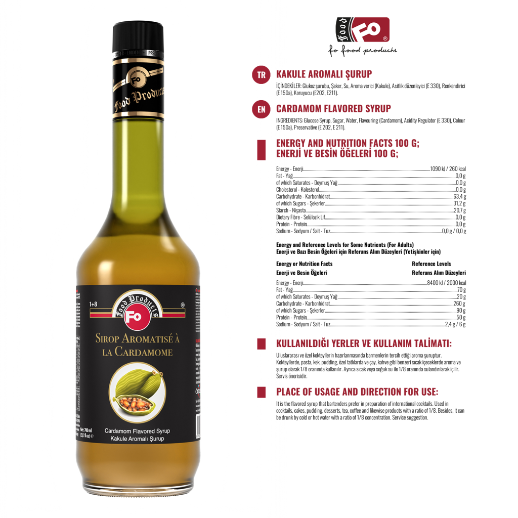 Ürün Özellikleri: Yapay tatlandırıcı içermez. Albenili ve sağlıklı ambalajı ile vitrinlerinize estetik bir görünüm kazandırır. Aroma, renk ve yoğunluk bakımından tercih nedenidir. Diğer şuruplara göre kuru madde oranı % 10 fazla olmasına rağmen, %30 daha az tatlıdır. Ağzı açıldıktan sonra kapak kapalı olarak muhafaza edilirse; son tüketim tarihine kadar aroma, renk ve yoğunluğunda herhangi bir azalma olmaz.