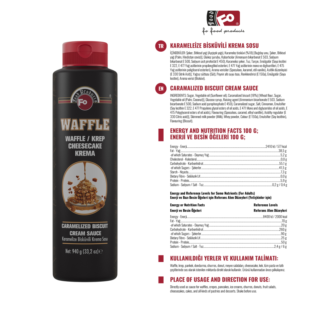 Kullanım Alanları : Waffle, krep, pankek, dondurma, churros, donut, meyve salataları, cheesecake, kek, tüm pasta ve tatlı çeşitlerinde sos olarak istenilen miktarda direkt olarak kullanılır. Ürünü kullanmadan önce çalkalayınız.