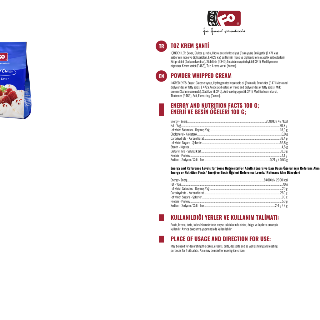 Ürün Özellikleri: Bitkisel yağ içerikli olup hayvansal katkı içermez. Çırpıldığında % 300 hacim artışı sağlar. Çırpma süresine dikkat edilmeli tarifteki süre kadar çırpılmalıdır. Aksi halde verim alınamaz. Gerçek şeker içermekte olup tatlandırıcı içermez. Çatlama, çökme, sararma ve ekşime yapmaz. Son derece dayanıklı ve lezzetlidir.
