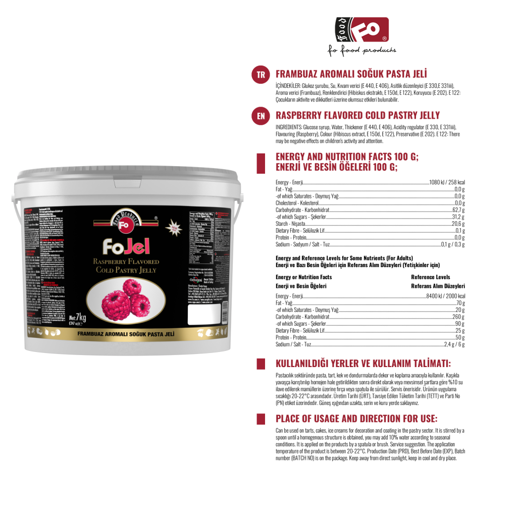 Ürün Özellikleri : Tamamen bitkisel olup hayvansal katkı içermez. Tutuculuk oranı (meyve üzerinde kalıcılık) fazla olduğundan Ürün üzerinde akma ve lastiklenme yapmaz. Ürünün buzdolabında kurumasını önler, tazeliğini korur. Parlaklığı ile ürünün albenisini artırır. Turtalarda ocak üzerinde herhangi bir karışıma gerek kalmaksızın kaynatılarak kullanılır. Doğal renklendirici ekstratlar ile zenginleştirilmiştir. Kaplama esnasında direkt olarak veya mevsim şartlarına göre %5-10 oranında su ilave edilerek ürün üzerine 20-22 derece ortam sıcaklığında spatula yardımı ile tatbik edilir. Meyve içerikli olduğundan açılmış ambalajın buzdolabında saklanması tavsiye edilir.