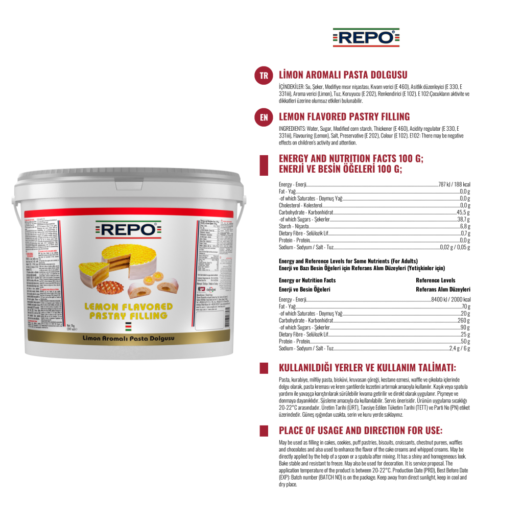 Ürün Özellikleri: Kuruma, çatlama ve matlaşma yapmaz. Parlak bir görünüme sahiptir. Kullanılabilir kıvama gelmesi kolaydır ve homojenliği bozulmaz. Bisküvi, kurabiye gibi yüksek sıcaklılara maruz kalan ürünlerde dolgu, özelliğini korumaktadır. Dışarıya sızma veya hamurun içinde emilme olmamaktadır. Serin ve kuru yerde muhafaza edilmelidir.