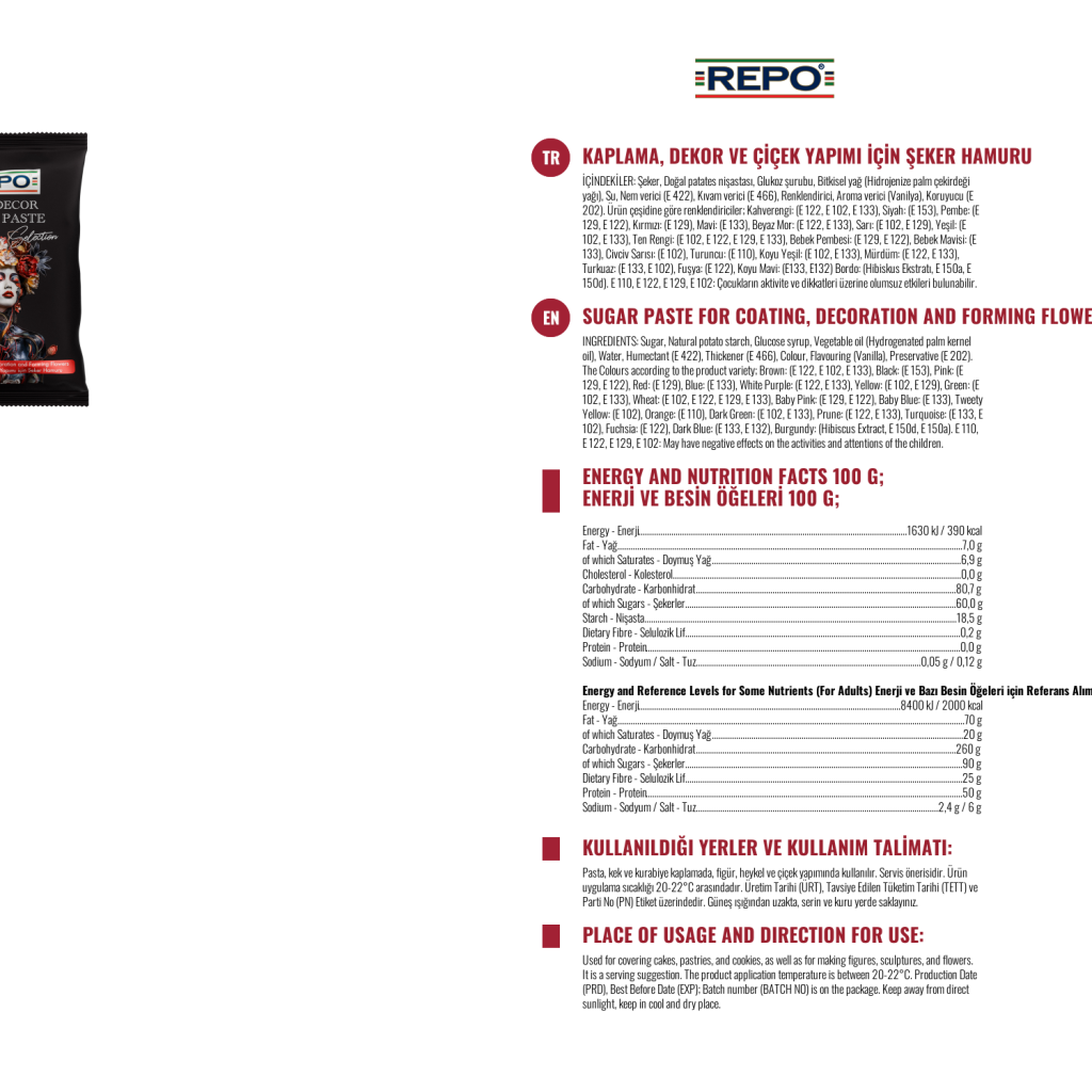Kullanım Alanları : Her türlü pasta kaplamalarında, dekoratif ve maket kaplamaları ve süslemelerinde, Çikolata ve sade kek kaplamalarında kullanılır.